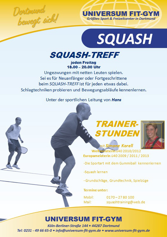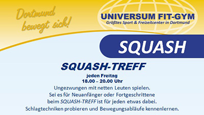 Squash ist eine Rückschlag Sportart bei der Ausdauer, Reaktion und Fitness verbessert werden. Das schnelle Spiel mit dem kleinen Ball ist ideal zum Stressabbau geeignet und ersetzt ein komplettes Fitness-Workout.